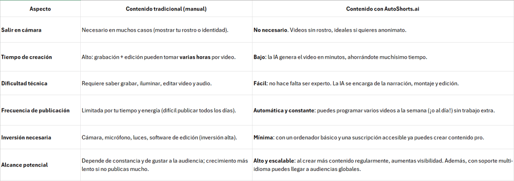 Usar AutoShorts.ai como aliado en tu estrategia de monetización digital tiene muchos beneficios. A continuación comparamos la creación de contenido tradicional vs. la automatizada con AutoShorts, para que veas el potencial de esta herramienta: